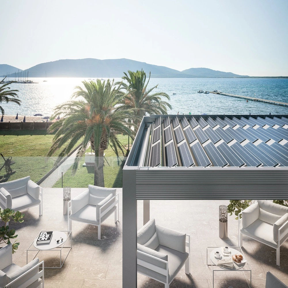• Zonne-energie pergola met zonnepanelen op terras aan zee