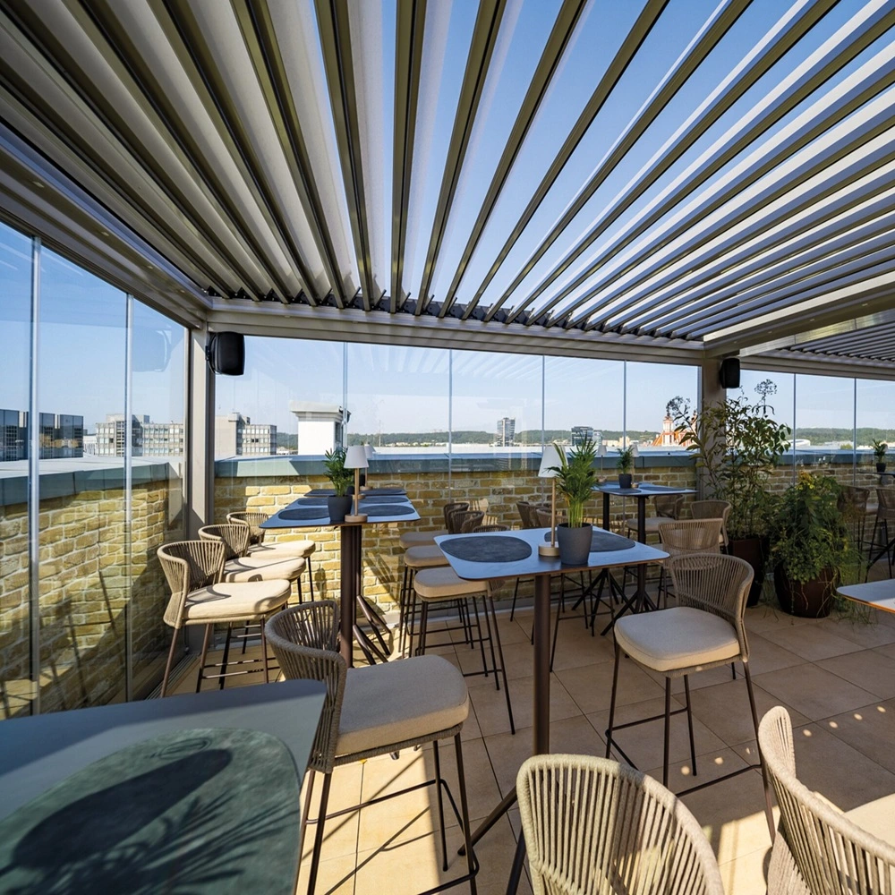 Met deze unieke overkapping hoef je nooit meer te kiezen tussen stijl en functionaliteit. De lamellen zijn eenvoudig verstelbaar, zodat je altijd kunt inspelen op het weer. Gasten blijven droog dankzij ingebouwde regengoten en genieten van een briesje op zonnige dagen.